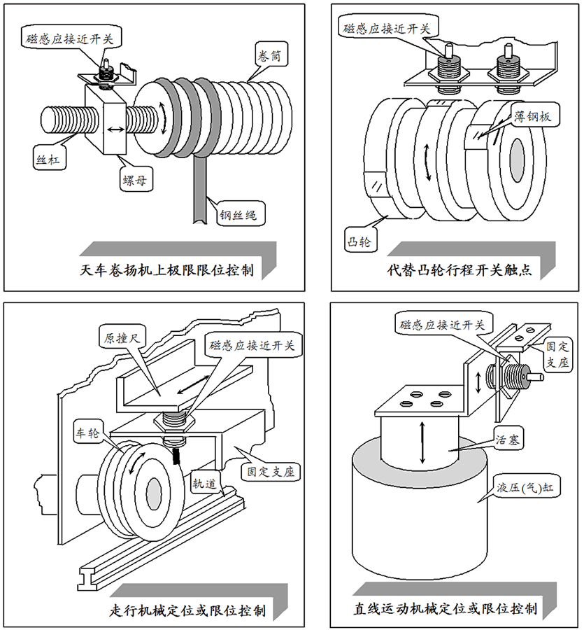 工矿企业自动控制系统中大量使用的行程开关、限位开关、保护开关、检测开关等是对生产车间中机器旋转(或直线)运动零部件或产品等进行行程、限位、保护、检测和位置自动控制的重要开关。当运动的物体移动到指定位置时,在机械力撞击的作用下使开关发出断开或接通动作信号,完成相关设备或机构进行所需要的动作控制。由于机械力对开关的撞击使机构易折断和磨损以及接点在断开时承受很高的自感电势作用下产生弧光使接点过早烧损,导致开关的备件消耗量很大。甚至由于动作失灵,造成停工、停产、人身伤亡及设备重大事故,多年来是工厂生产中的老大难问题。